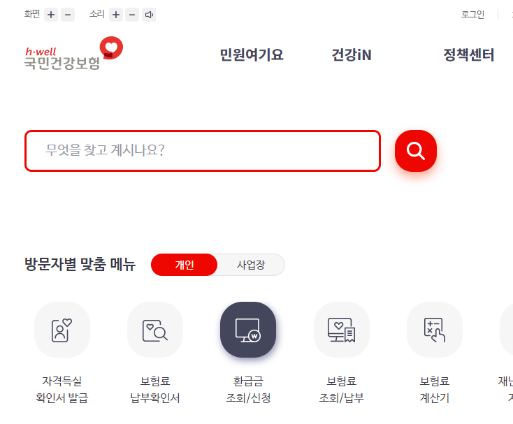 먼저 공단 홈페이지의 첫 화면에서 "환급금 조회/신청"을 누릅니다.