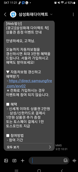 그래서, 올해도 삼성화재다이렉트 자동차보험에 가입하기로 하였습니다. 삼성화재다이렉트 자동차보험에 가입하고 계신 분들이 라면 약 1개월 전에 아래와 같은 문자가 옵니다. 그러면 다음의 링크에서 가입하는 경우 신세계상품권 2만 원권을 받으실 수 있습니다.