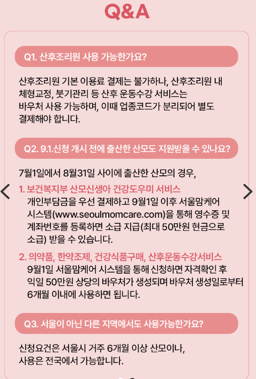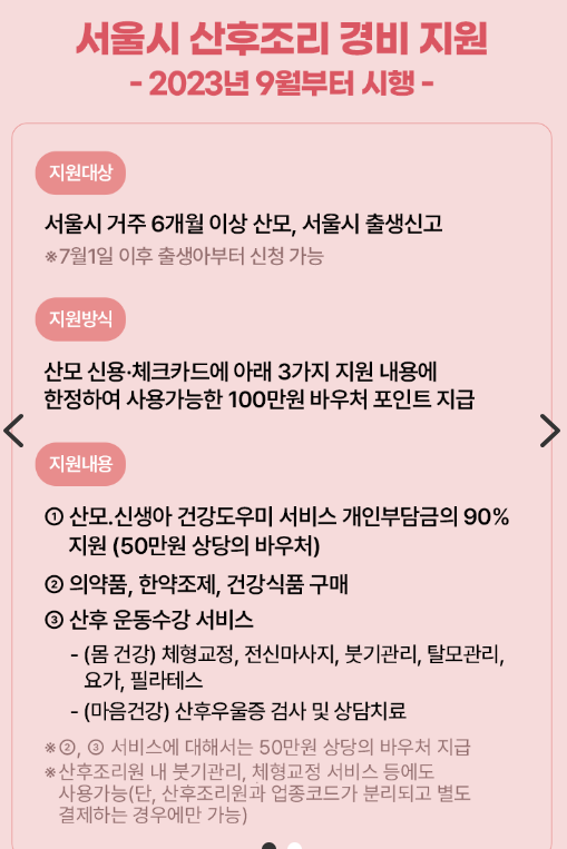 | 신청 자격 요건 | 올해 7월 1일 이후 출산한 산모로 아이의 출생신고가 완료되어 있어야 하며, 신청일 기준으로 최소 6개월 동안 서울에 거주하는 경우 |