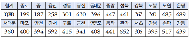 자치구별 신청 인원 종로 199, 중구 187, 용산 258, 성동 301, 광진 430, 동대문 396, 중랑 447, 성북 441, 강북 367, 도봉 340, 노원 485, 은평 489, 서대문 360, 마포 400, 양천 394, 강서 592, 구로 415, 금천 341, 영등포 408, 동작 441, 관악 652, 서초 306, 강남 395, 송파 517, 강동 439