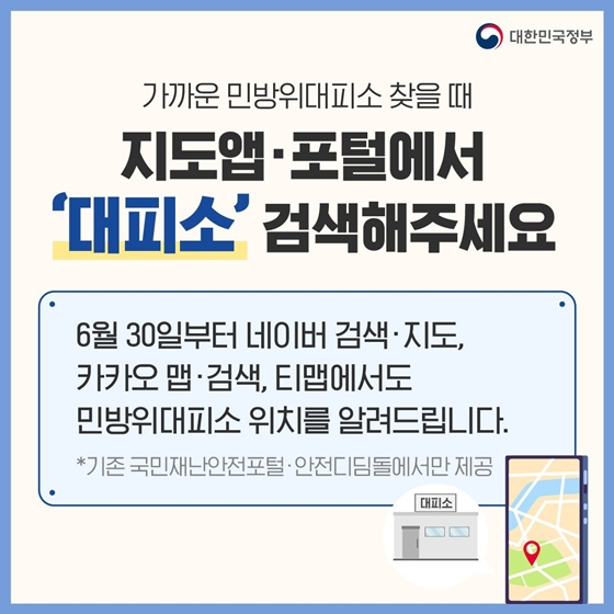 1. 가까운 민방위대피소 찾을 때 지도앱·포털에서 ‘대피소’를 검색하세요!(6.30.~)