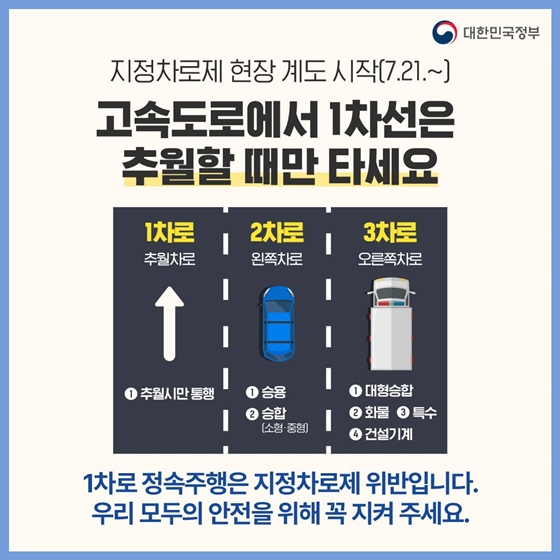 3. 고속도로에서 1차선은 추월할 때만 타세요! 지정차로제 현장계도 시작(7.21.~)