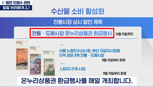 일본의 원전 오염수 방류로 우리 어업인과 소상공인들에게 피해가 갈 것을 우려하여 정부에서 연말까지 온누리 상품권 환급행사를 진행한다고 합니다.